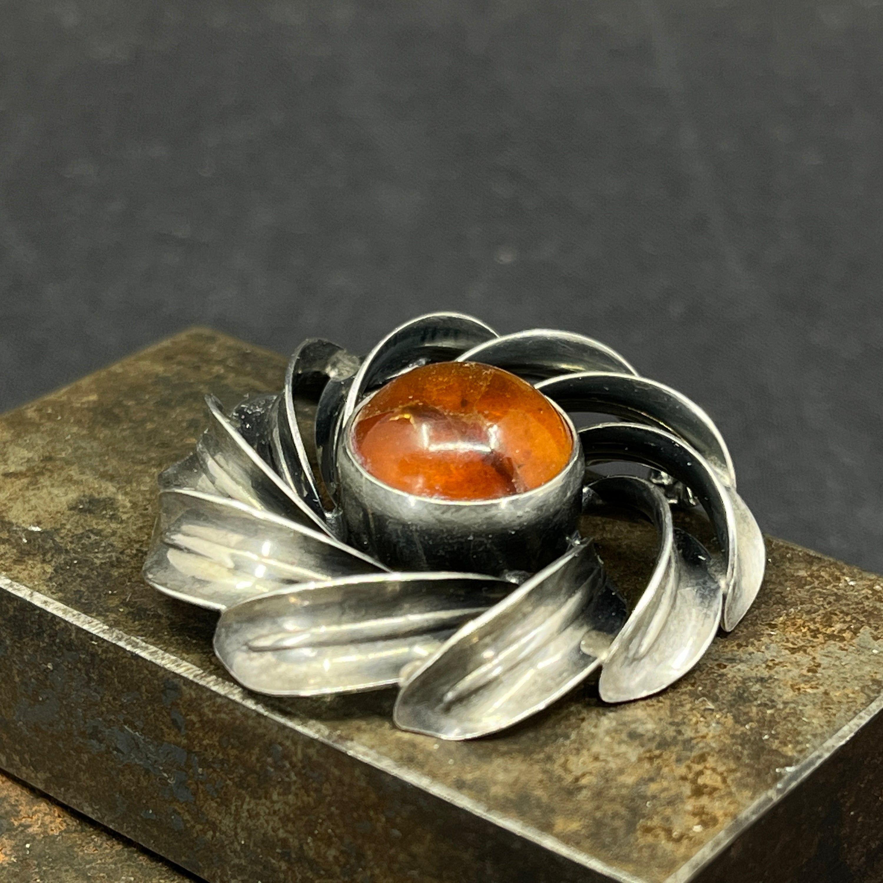 Moderne broche af sølv med rav