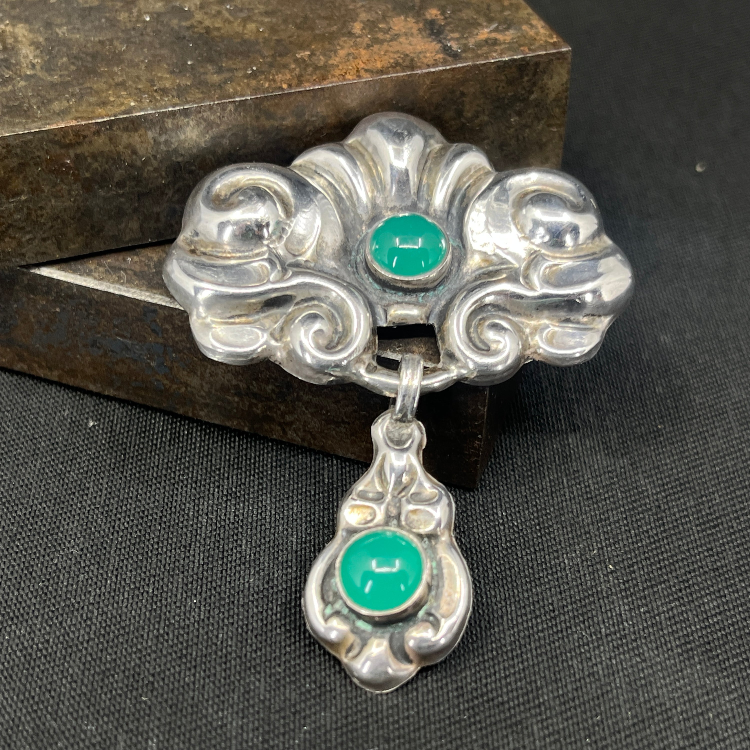 Lille skønvirke broche med chrysoprasser