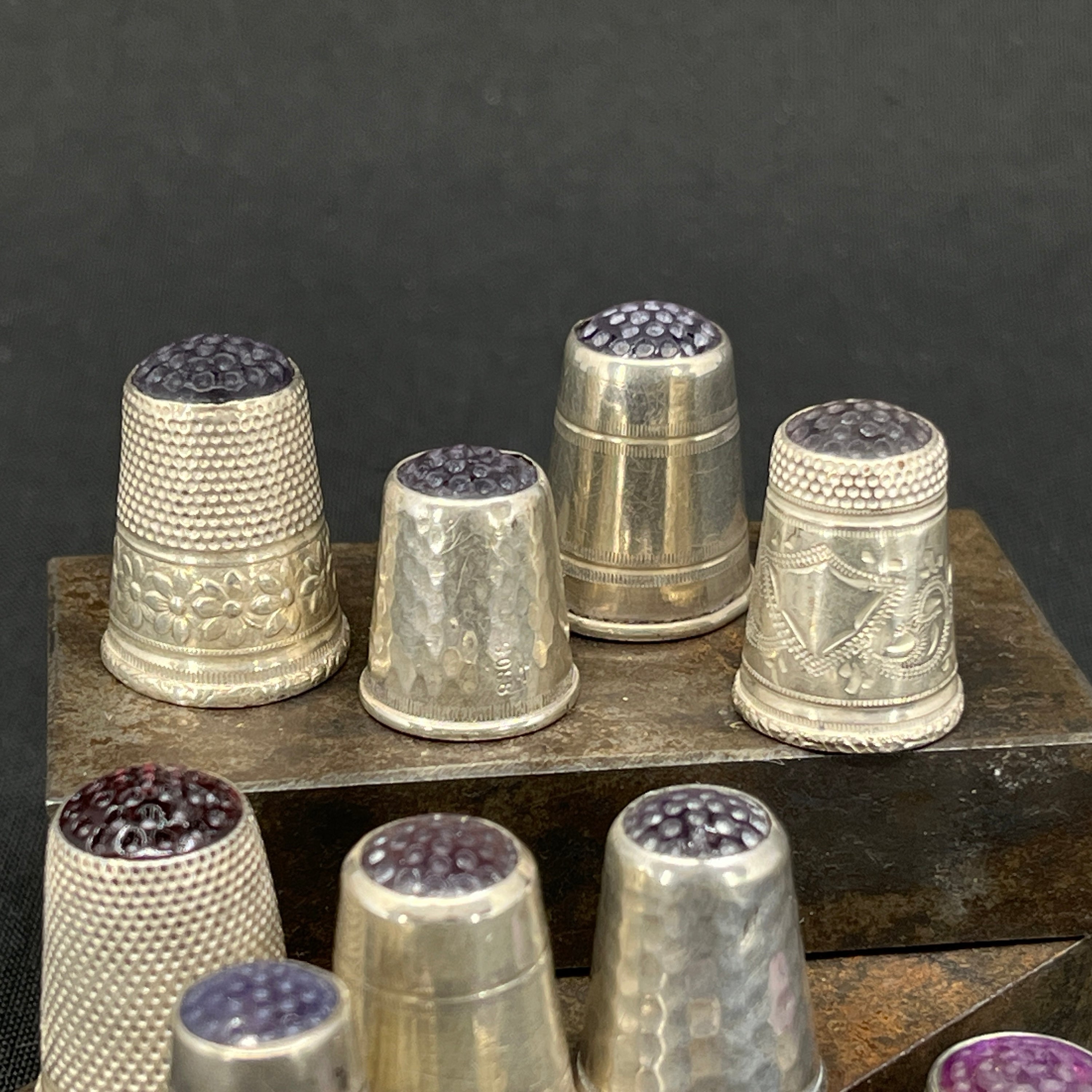 Silver thimble with stones - red shades