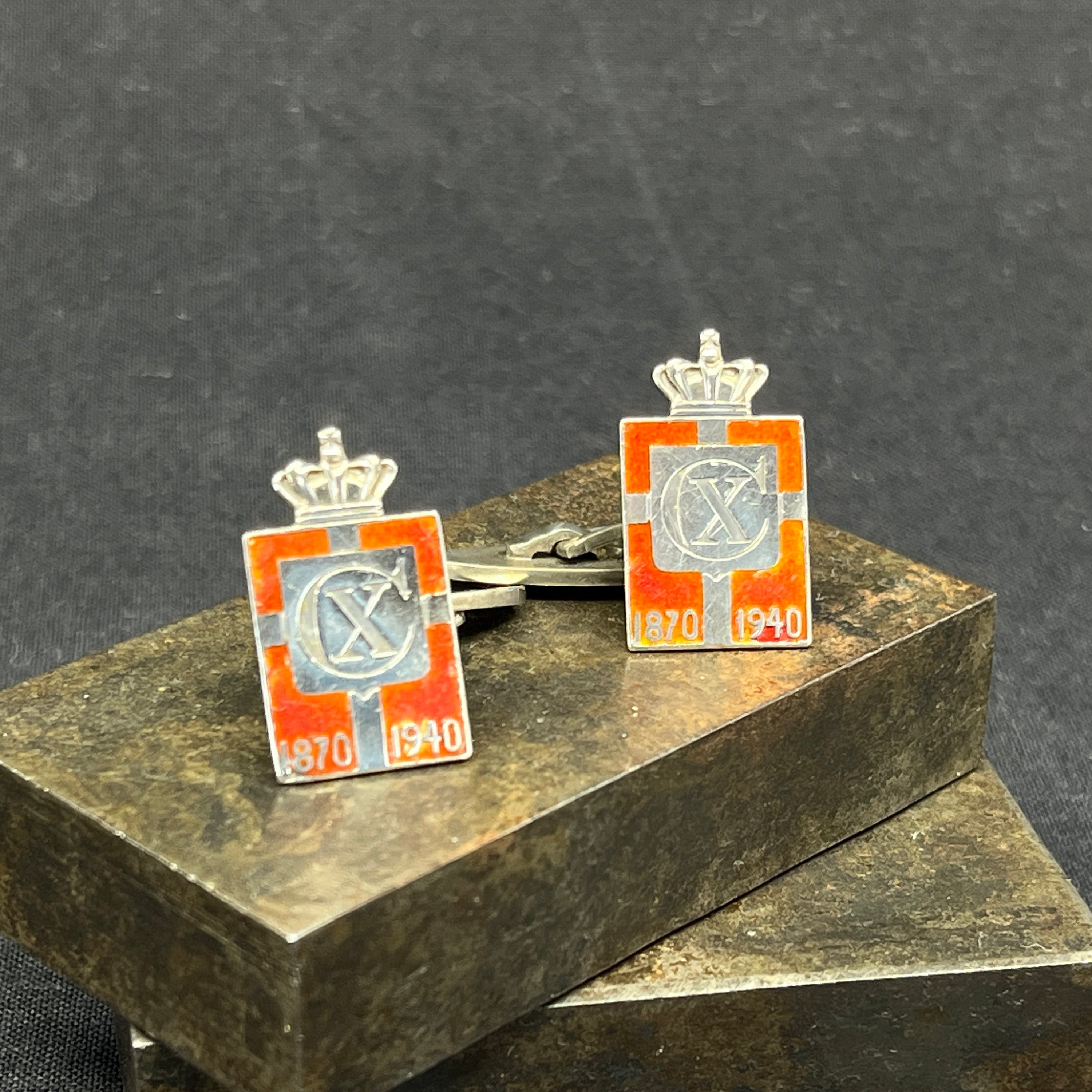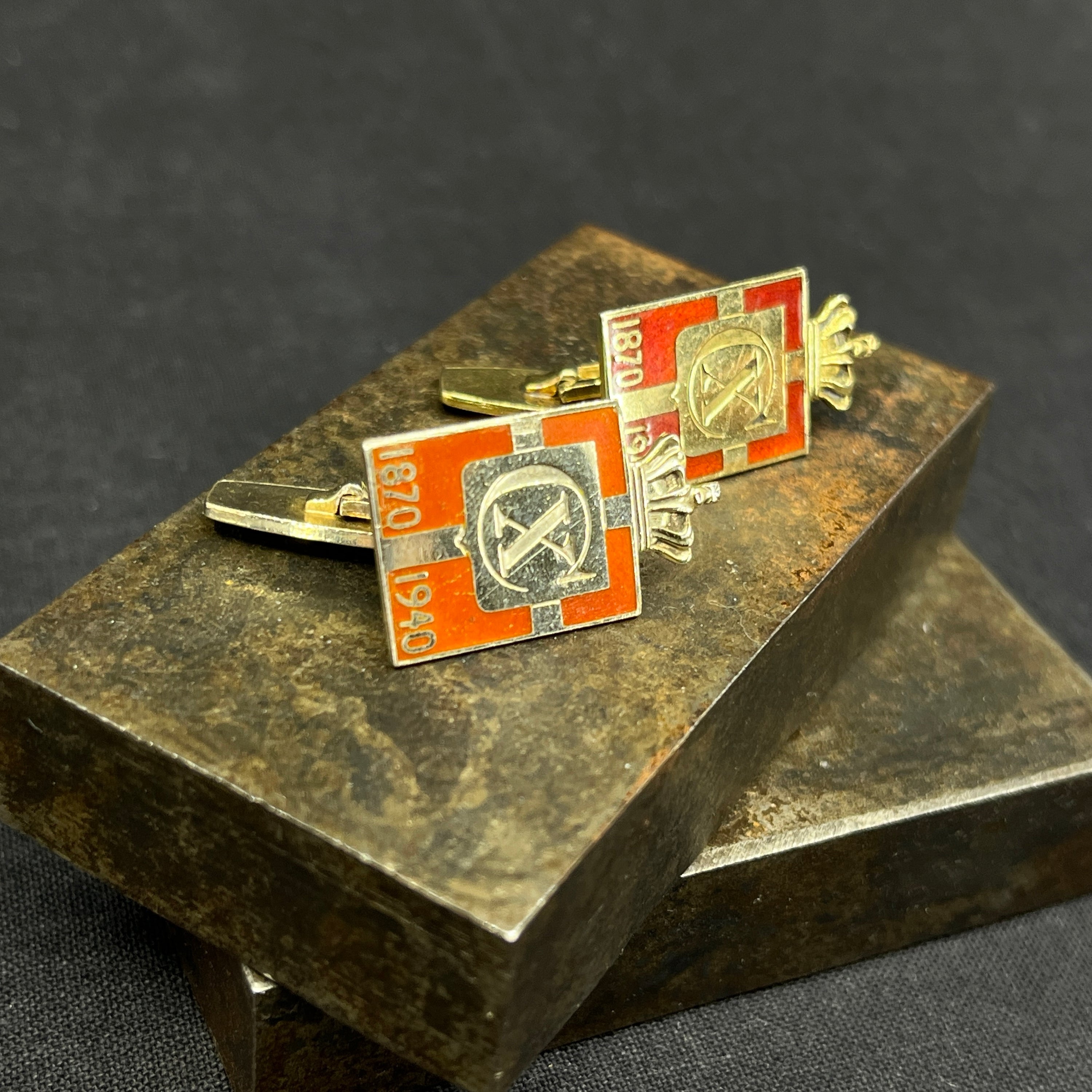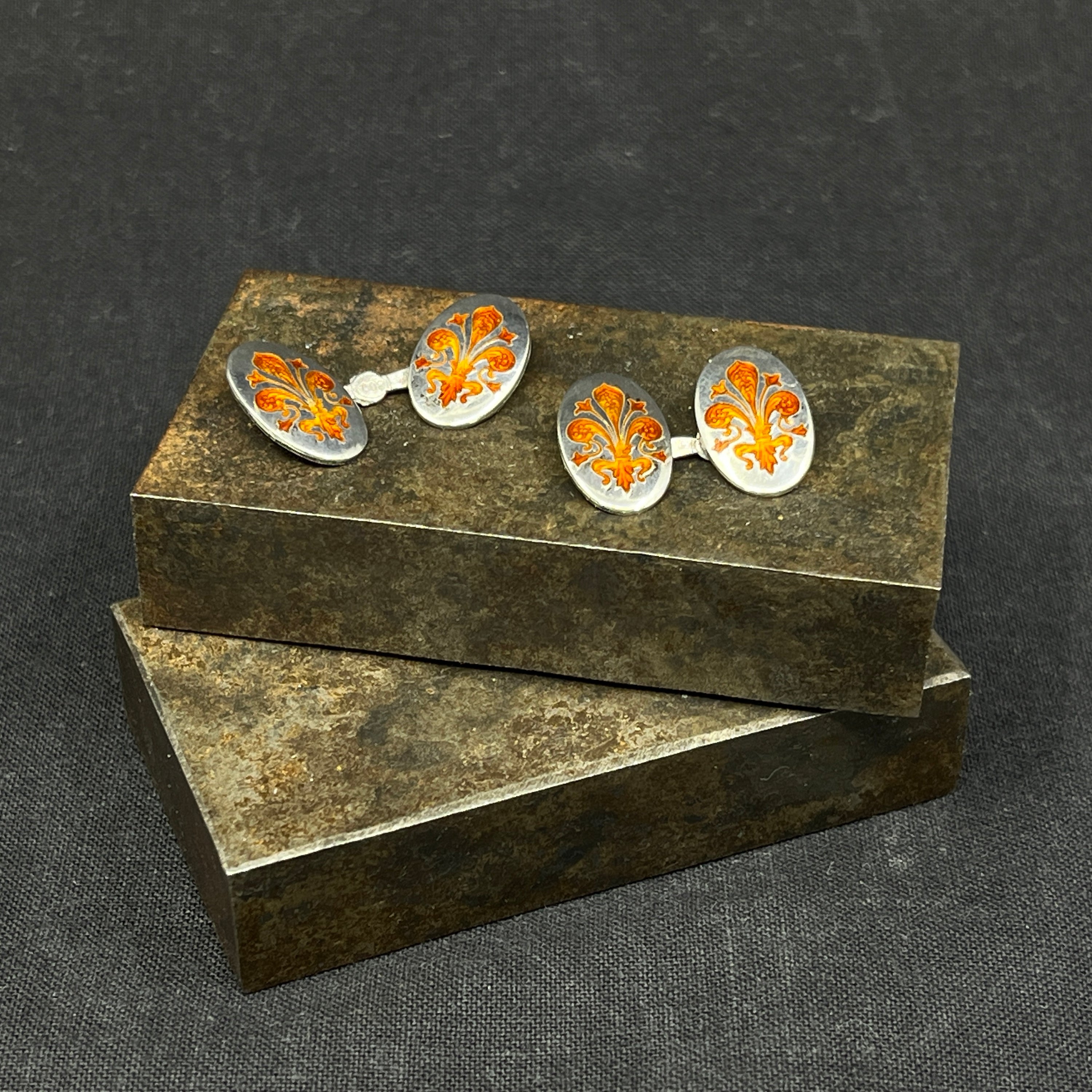 A pair of cufflinks with orange enamel